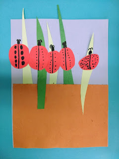 , students in kindergarten and first grade created friendly ladybug collages and imagined how it would feel to be a ladybug courageously climbing up a blade of grass.